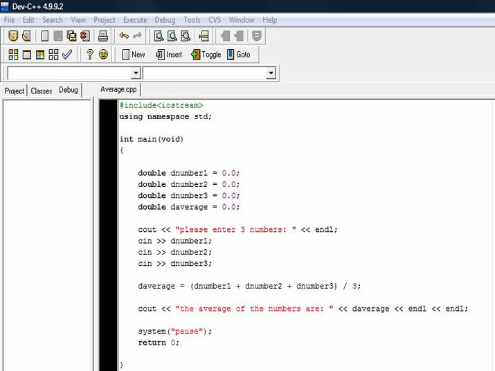 Programming C++ I begun teaching myself how to program using C++. This is the very first thing I created in C++, it is an application which determines the average of 3 different numbers. I created in a free piece of software called Dev-C++. Click here to try my average application yourself. |
